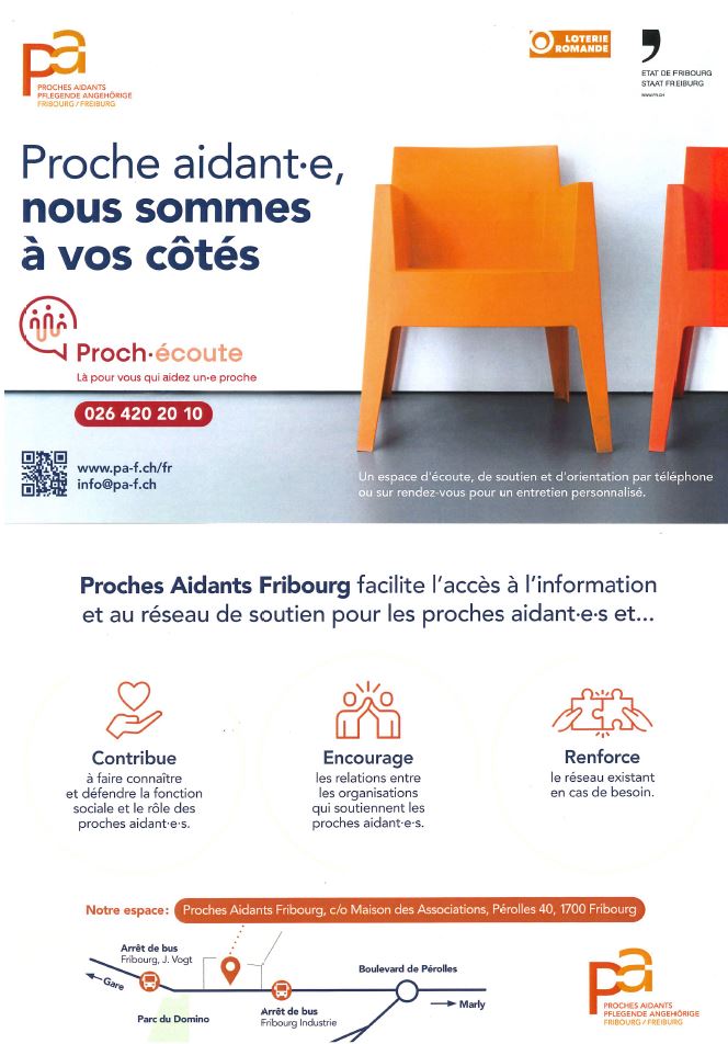 Il existe dans le canton de Fribourg plusieurs associations ou institutions qui peuvent apporter des soutiens aux proches aidant-e-s, sous différentes formes. Le canton de Fribourg est l'un des seuls cantons suisses à octroyer une indemnité forfaitaire pour proches aidant-e-s.